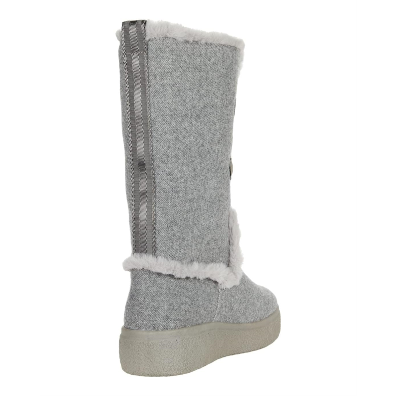 Pull-on cold weather boot with closed rounded toe and platform midsole.
