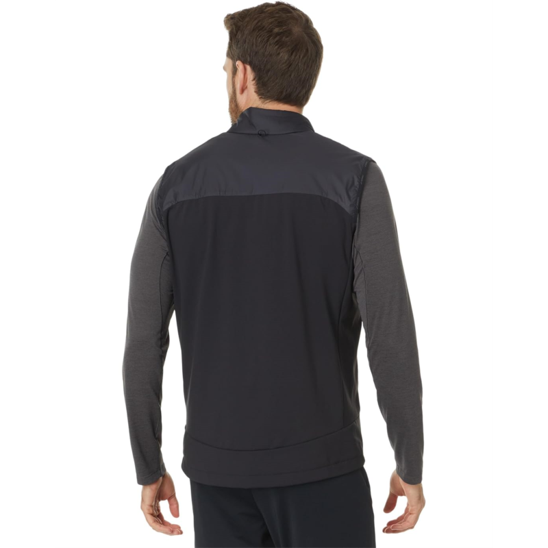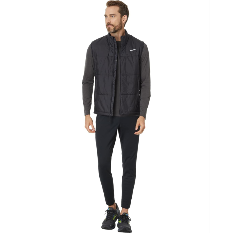 Enjoy comfy and cozy vibes by layering up the Brooks Shield Hybrid Vest 3.0 that provides targeted winter protection for super-cold conditions. The fitted, sleeveless vest comes with a windproof DWR -treated fabric that is designed to keep the elements out and a higher collar design that helps prevent chill. The strategically placed Thermolite insulation retains warmth, while zoned breathibility helps prevent overheating. It features a full center-front zipper closure, two hand pockets on the front, and a straight hem.