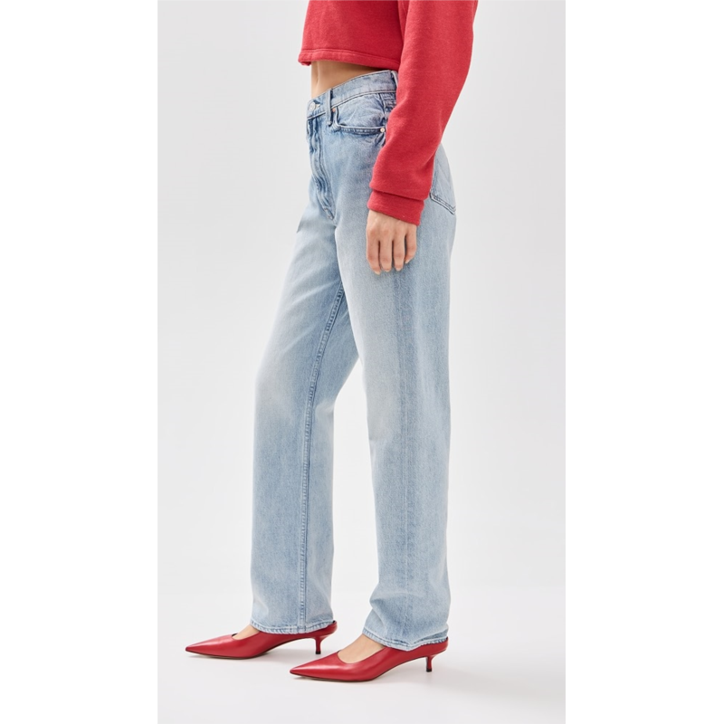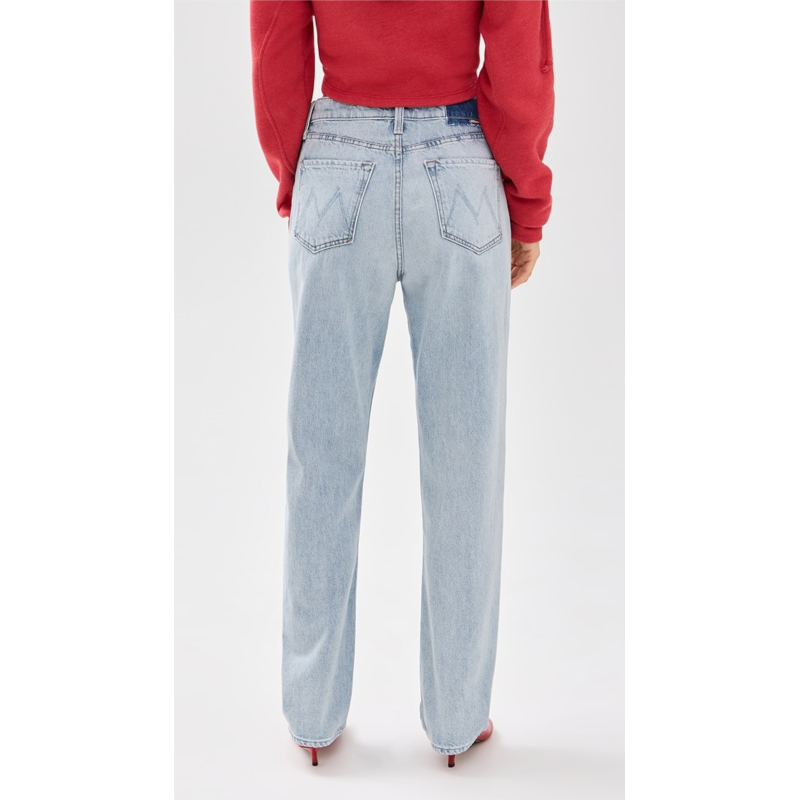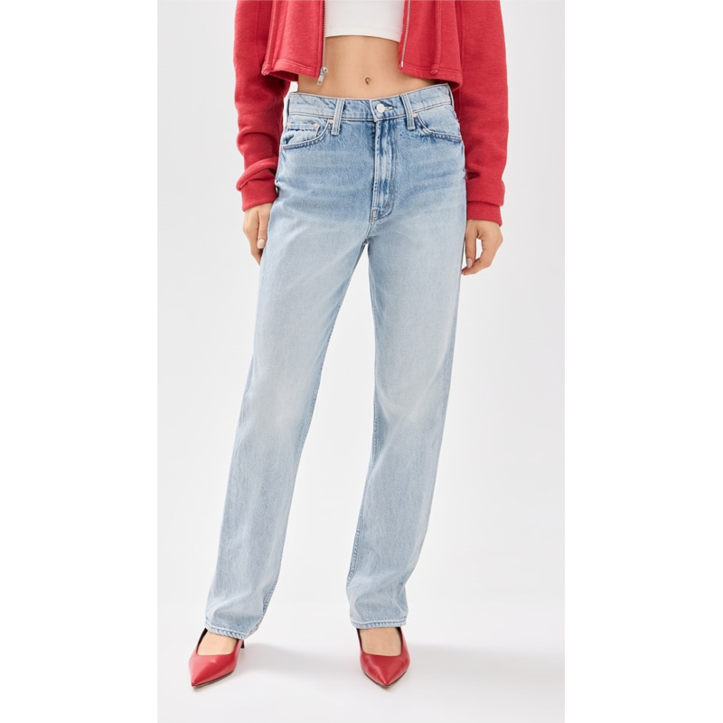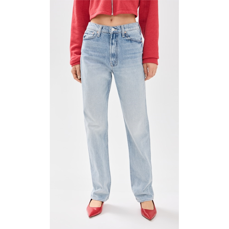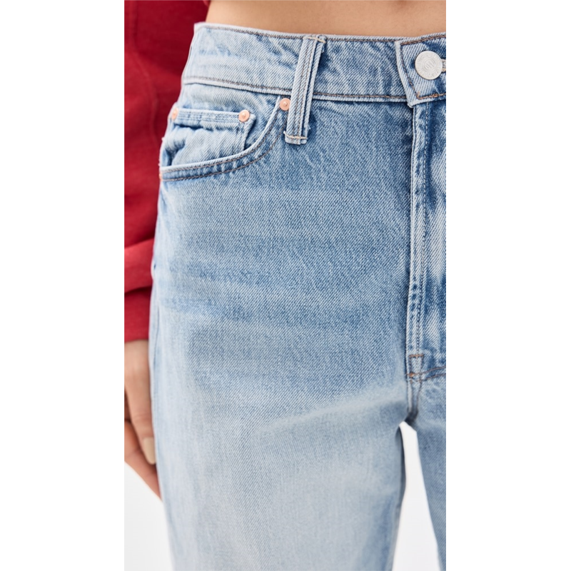 Features a high-rise fit and a straight-leg silhouette. Non-stretch denim has a mid-weight feel.