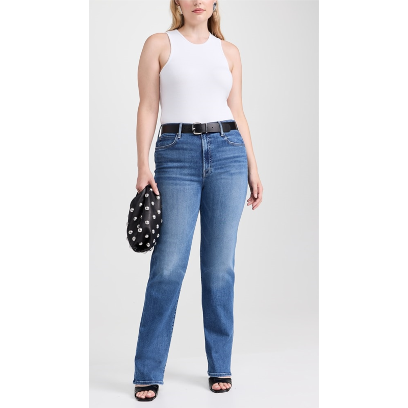 Designed with a high rise and a straight leg, which has a long inseam. Super-stretch denim has a softened, mid-weight feel.
