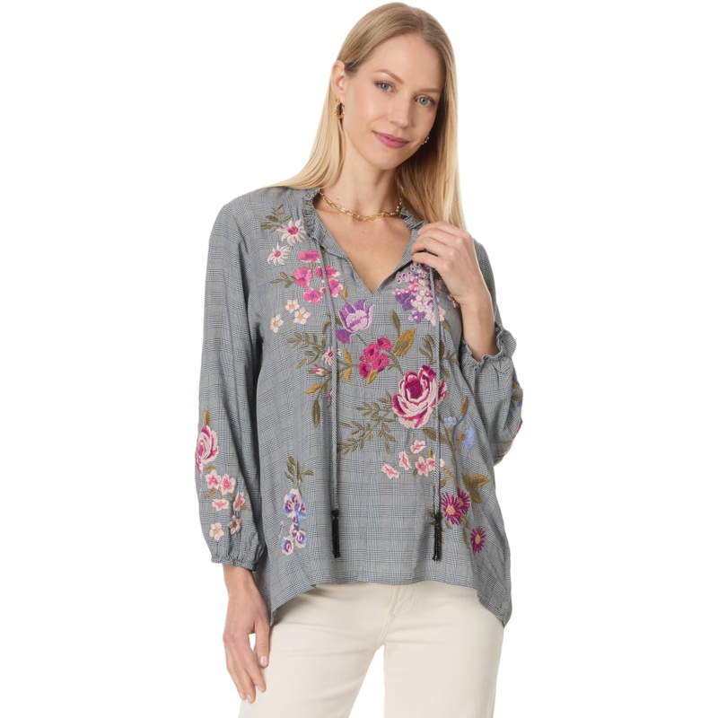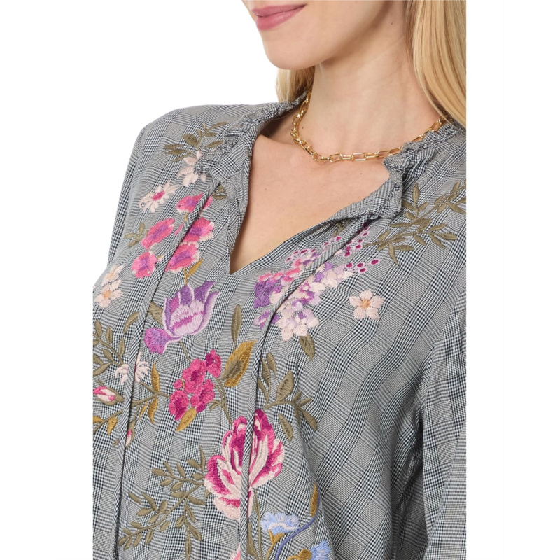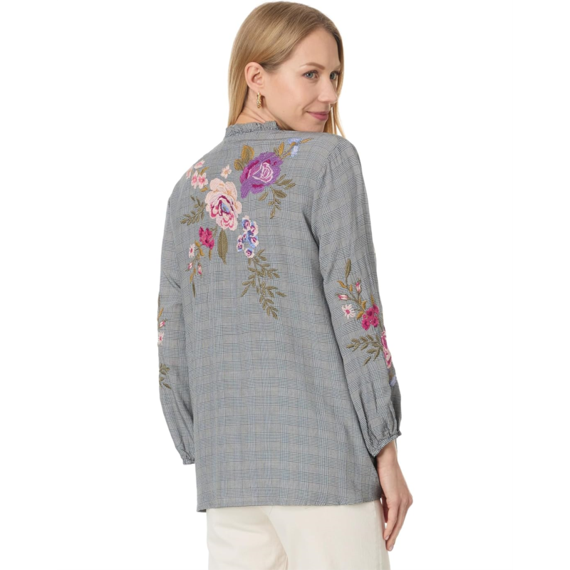 Dress your heart out wearing the stylish Johnny Was Field Blouse - Georgiana. Featuring mandarin neckline, three-quarter sleeves, regular fit, plaid detailing with colorful embroidery, and curved hemline.