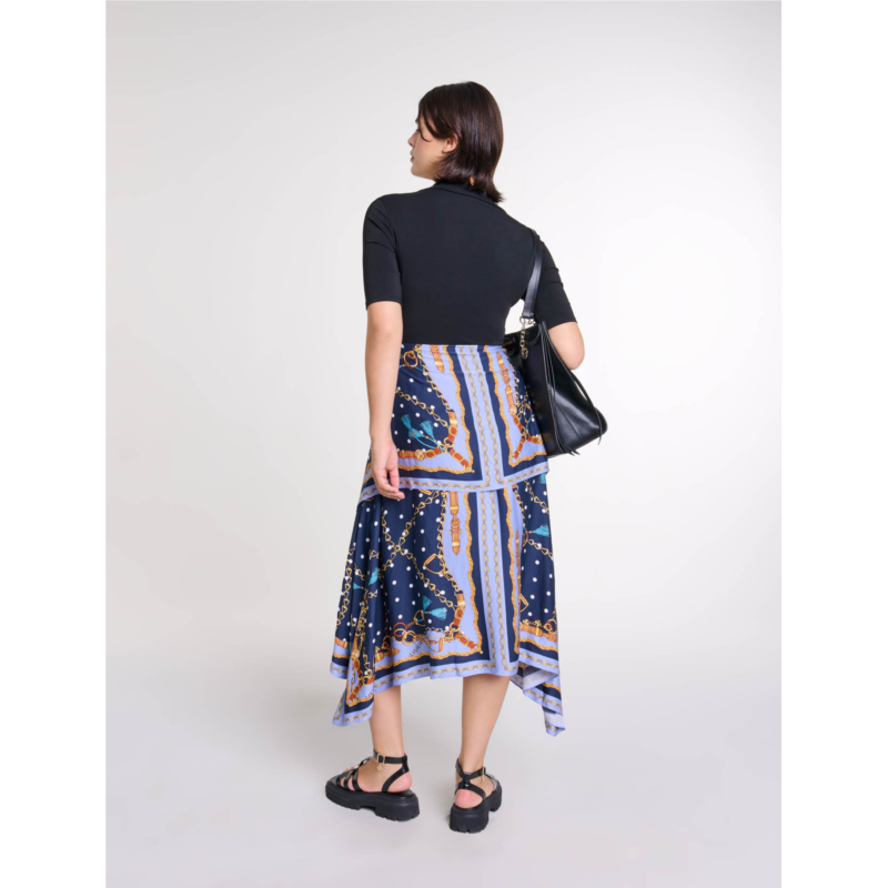 This illusion-effect maxi dress features an interplay of contrasts and volumes, with a plain polo top and a satin-effect skirt with a scarf motif. There are two panels at the front that tie like a long-sleeved top so you can adjust it to suit you, with an asymmetrical hem beneath.