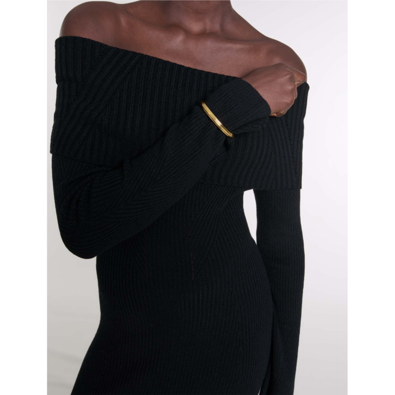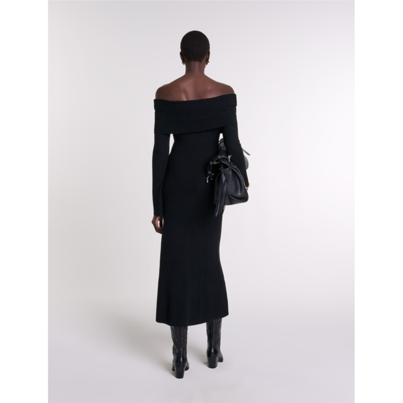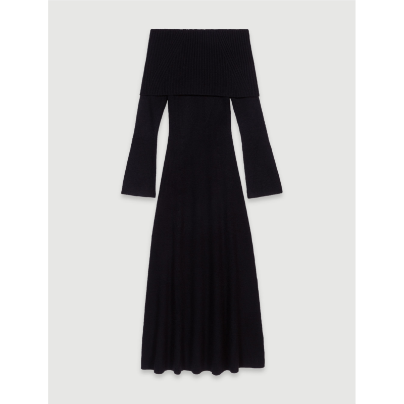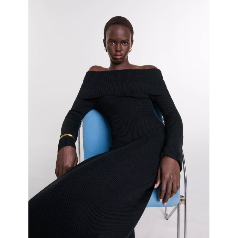 This rib knit maxi dress has a flattering snug design for a flattering longline fit. The long sleeves and wide XL neckline show off your bare shoulders, accentuated by the broad ribbing. Slightly flared cuffs and hem for timeless elegance.