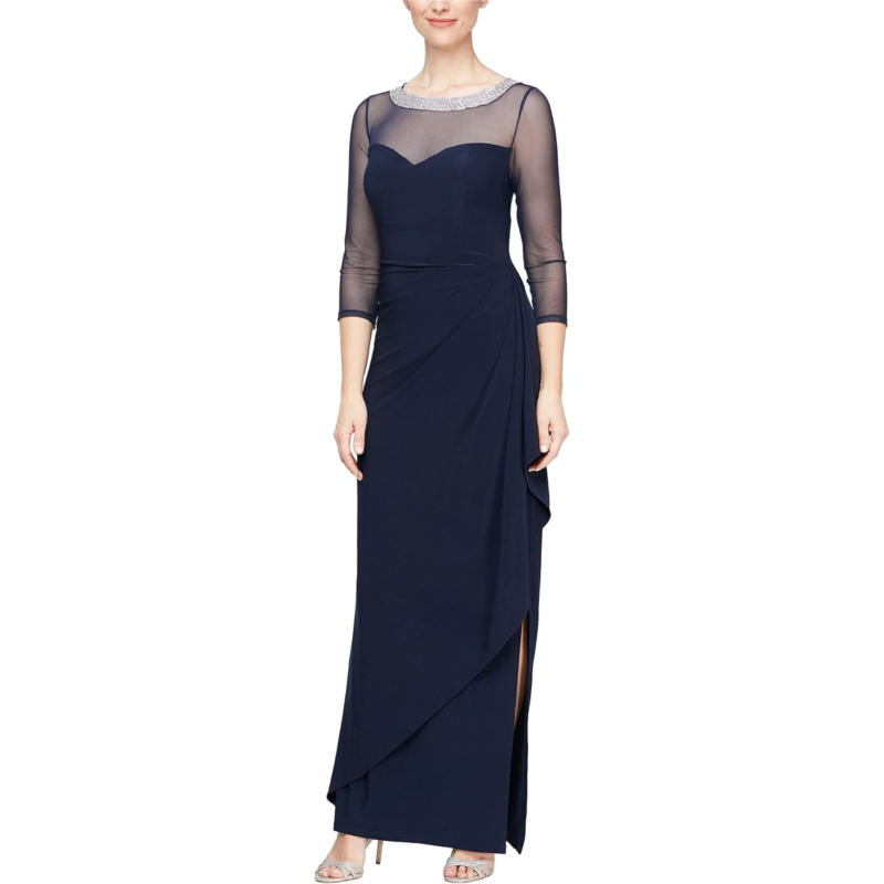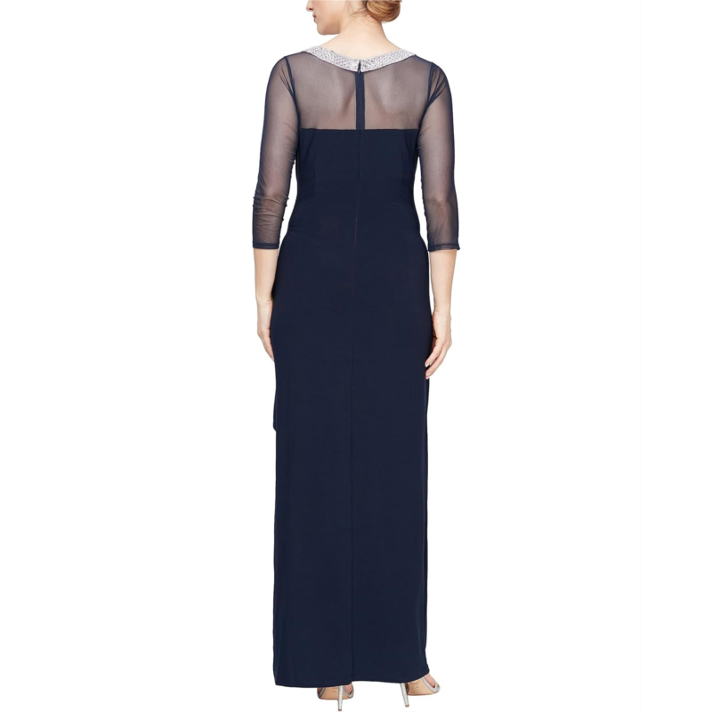 Alex Evenings Long Illusion 3/4 Sleeve Side Ruched Dress w/ Embellished Neckline