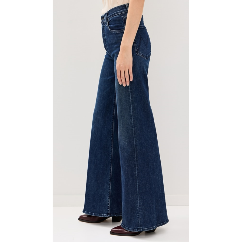 Designed with a high rise and a flared wide leg. Stretch denim has a mid-weight feel.