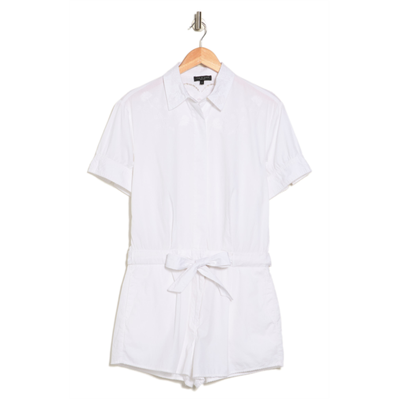 Tonal embroidery and fine picot edging lend contemporary appeal to a utilitarian-inspired romper rendered in lightweight cotton.