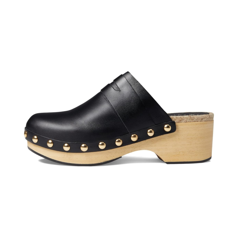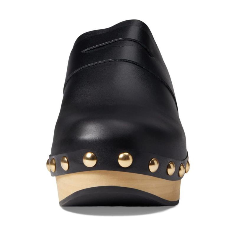 Sleek leather upper with goldtone studs on the edges.