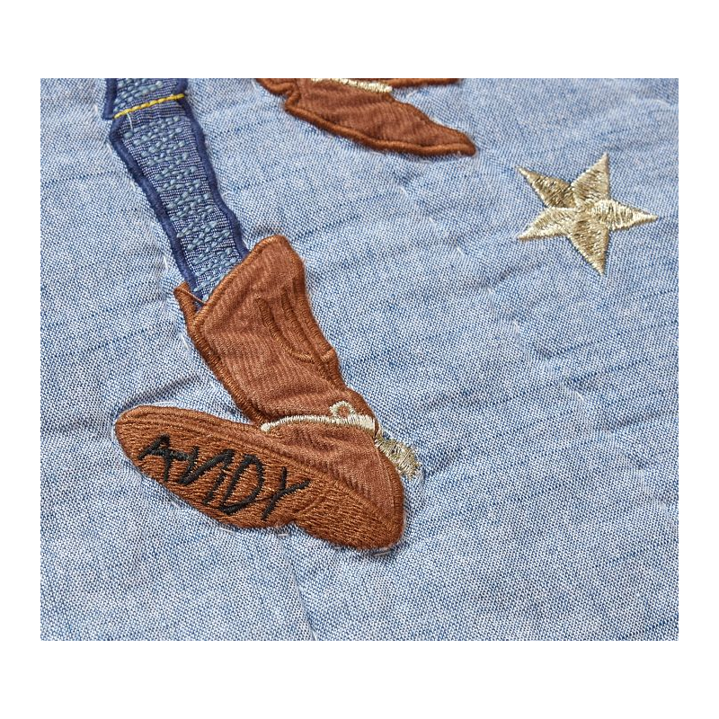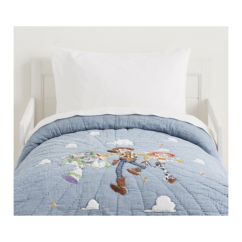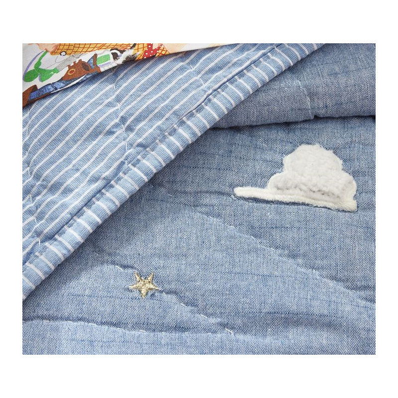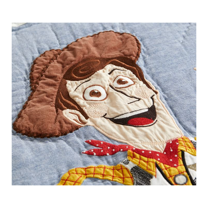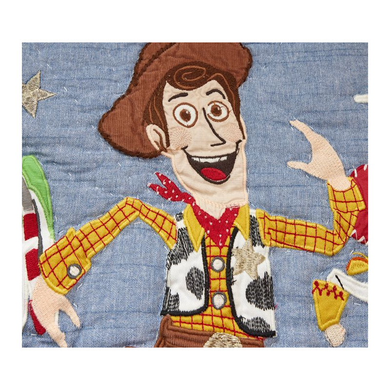 Set the stage for bedtime fun with Woody, Jessie and Buzz Lightyear from Disney and Pixar’s Toy Story! The Quilt is hand decorated with appliqued fabrics and colorful embroidery, the soft cotton chambray is hand quilted over pure cotton fill for lightweight warmth and breathable comfort.