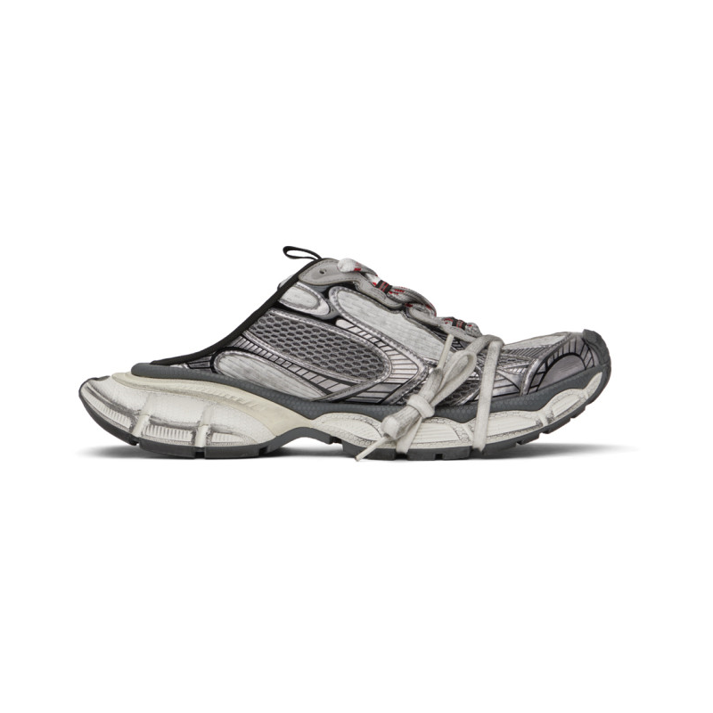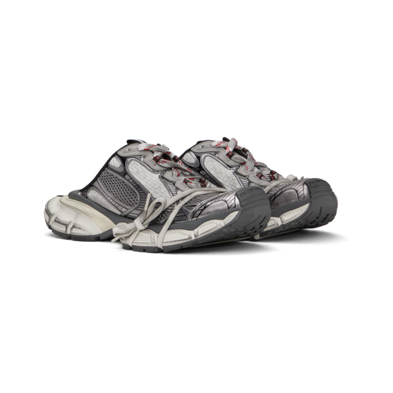 Paneled mesh and buffed faux-leather slip-on sneakers in gray, white, and red. Smudging throughout.