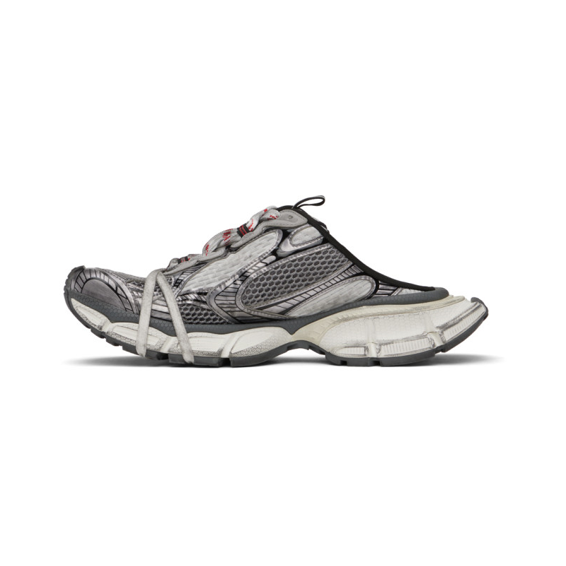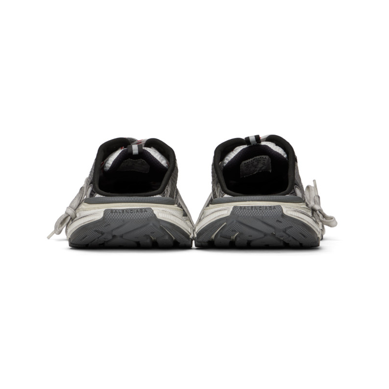 Paneled mesh and buffed faux-leather slip-on sneakers in gray, white, and red. Smudging throughout.