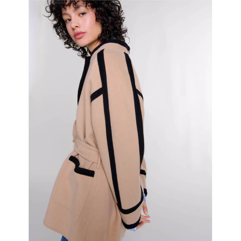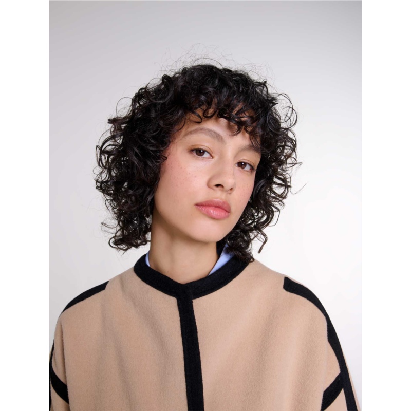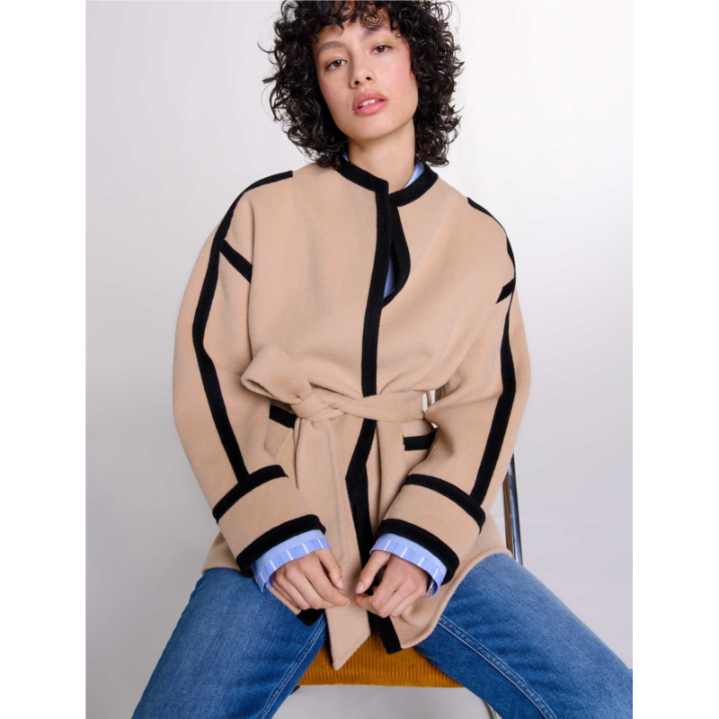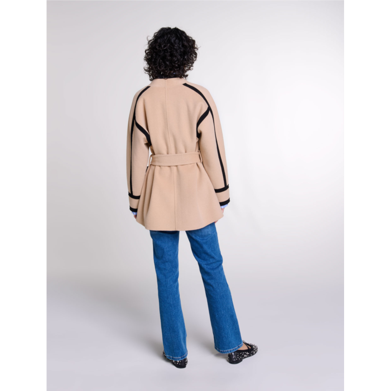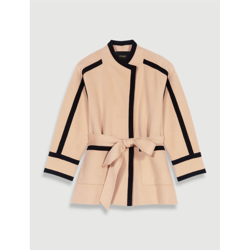 Made from a wool blend, this double-sided short coat features an interplay of contrasts and volumes, with assertive lines. Featuring a slightly stand-up double-breasted collar and long sleeves, it has a button fastening and two front patch pockets. Black piping and a belt that ties at the waist add structure and a bold touch to the perfectly fitted silhouette.