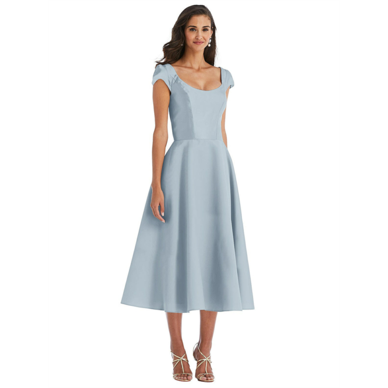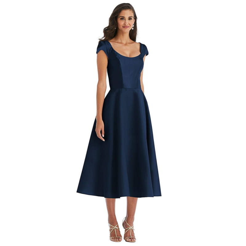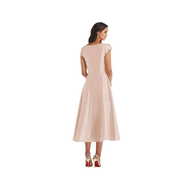 [US] Alfred Sung puff cap sleeve full skirt satin midi dress