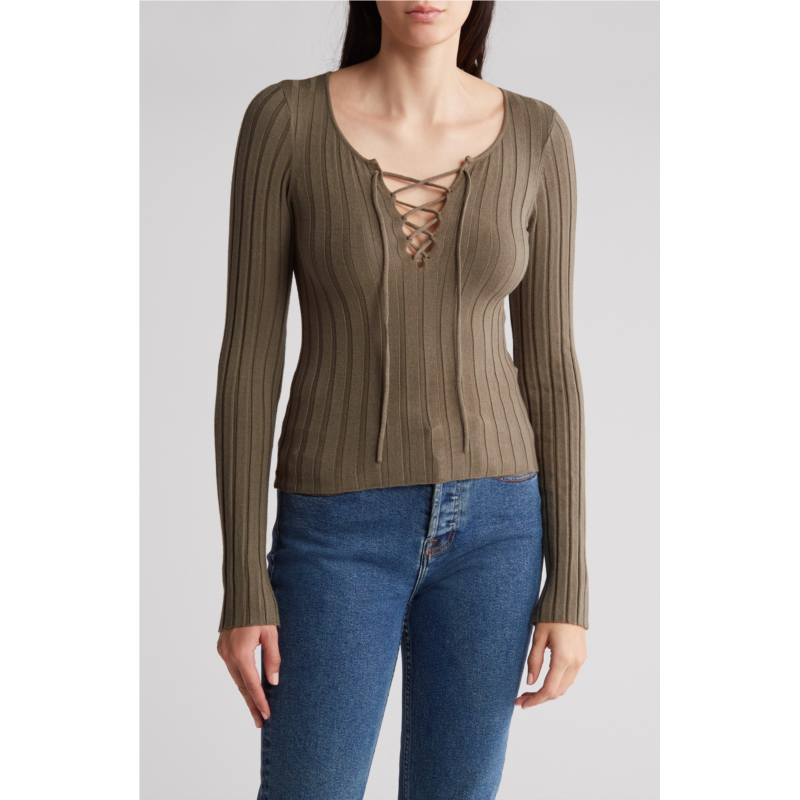 A lace-up neckline elevates this long-sleeve top crafted from softly ribbed knit fabric.