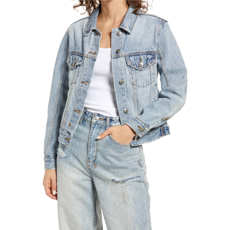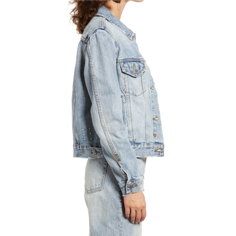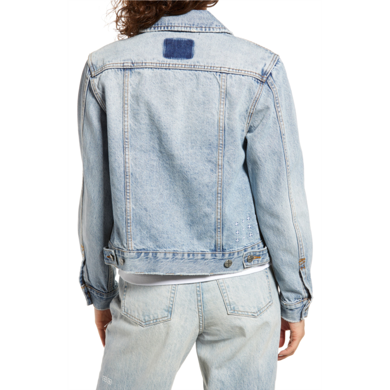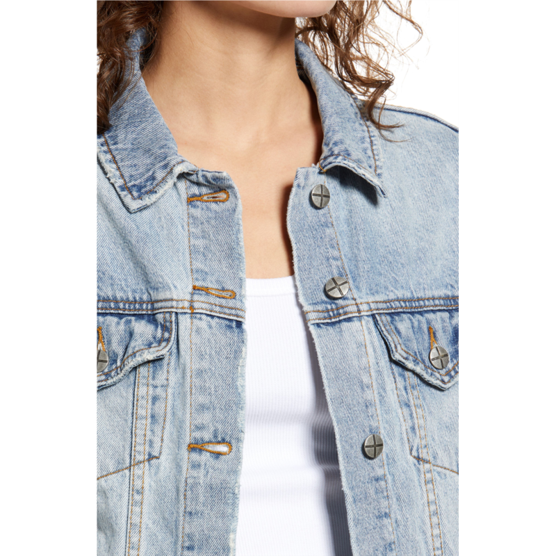 Trucker details and distressed edges give a lived-in look to this faded denim jacket that has a slim fit and anti-patch detail on the back yoke.