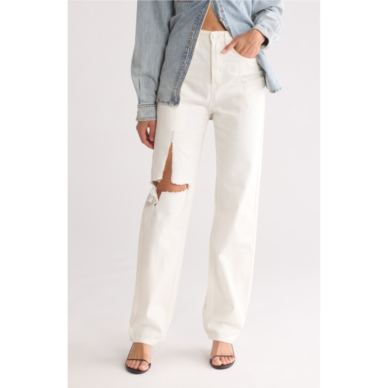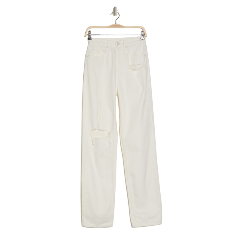 A dramatic rip at the knee lends worn-in cool to these straight-leg jeans made from crisp white nonstretch denim.