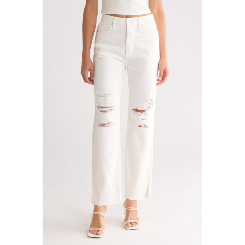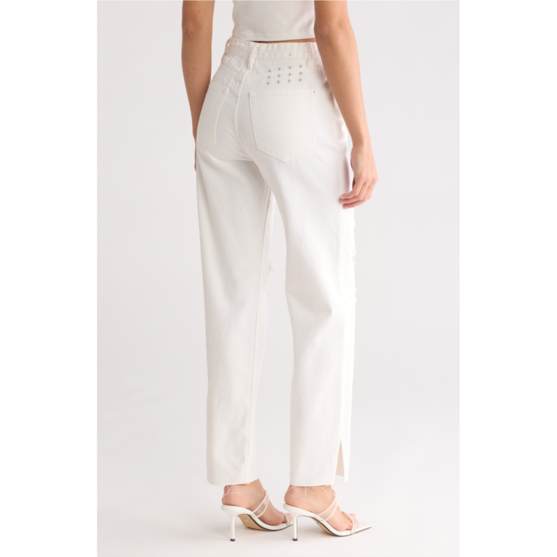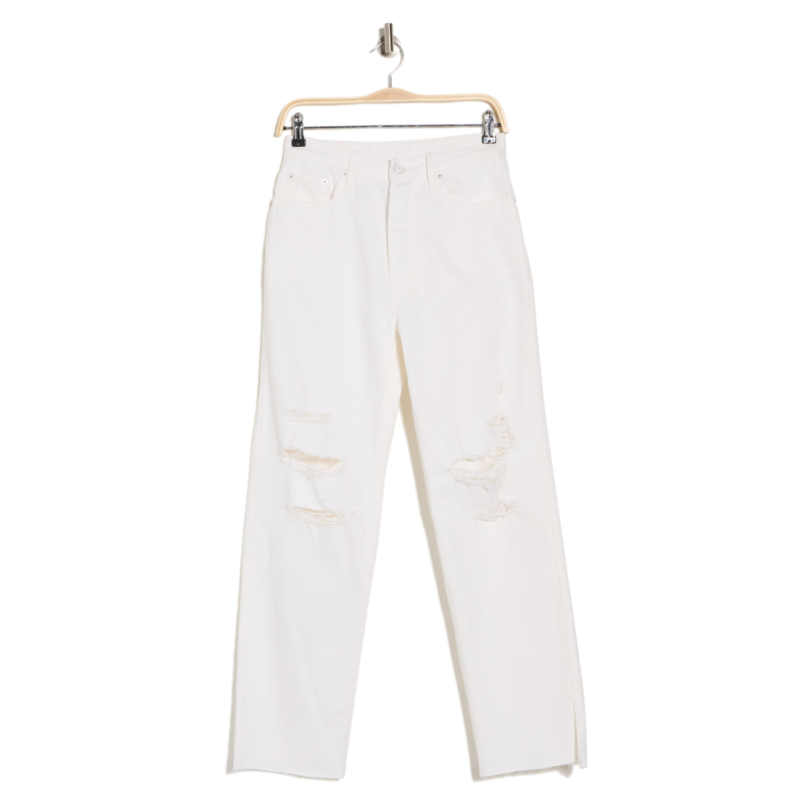 Rips at the knees create a worn-in look on these crisp white nonstretch jeans cut in a straight-leg silhouette.