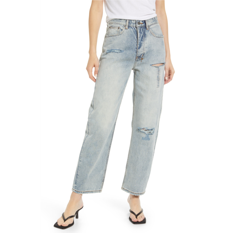 Made from stonewashed nonstretch denim, these roomy straight-leg jeans tell a well-loved style story with a patchwork of distressed accents.
