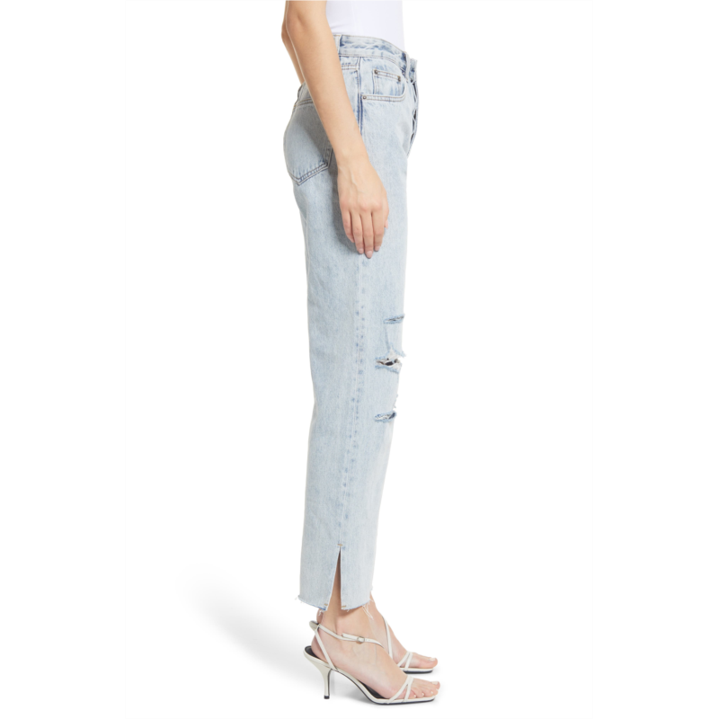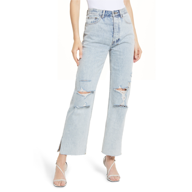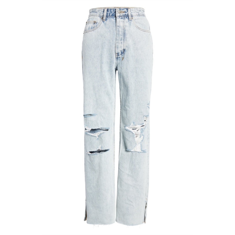 Split hems and rugged distressing lend distinctive character to these straight-leg jeans that come in a light, powdery wash.