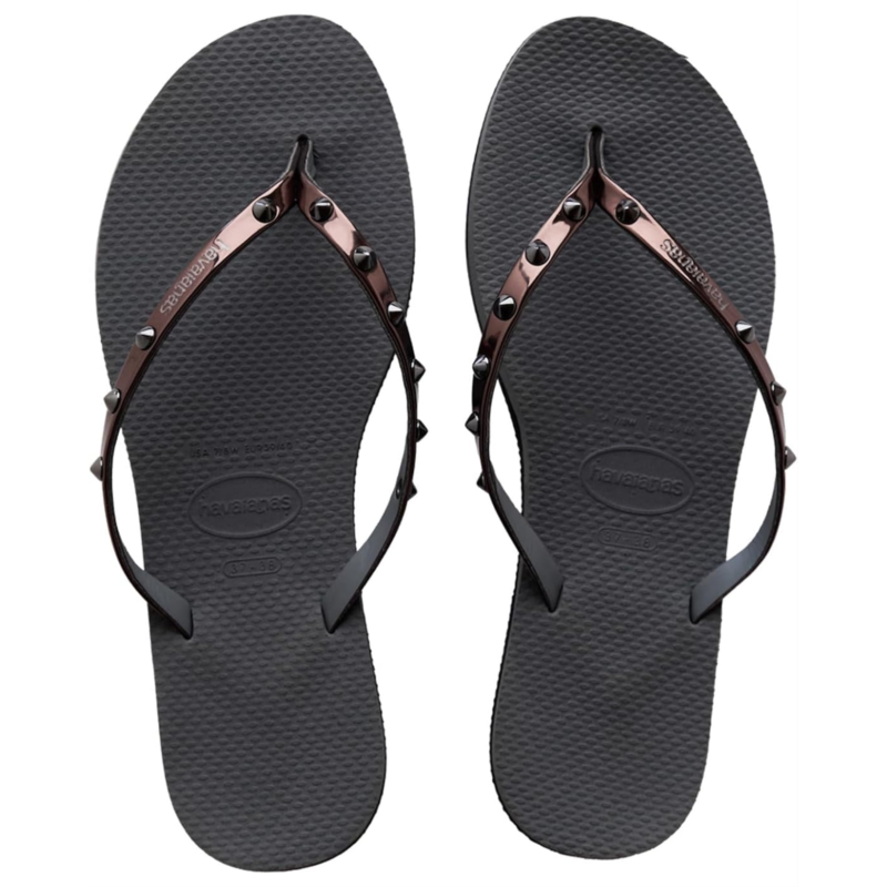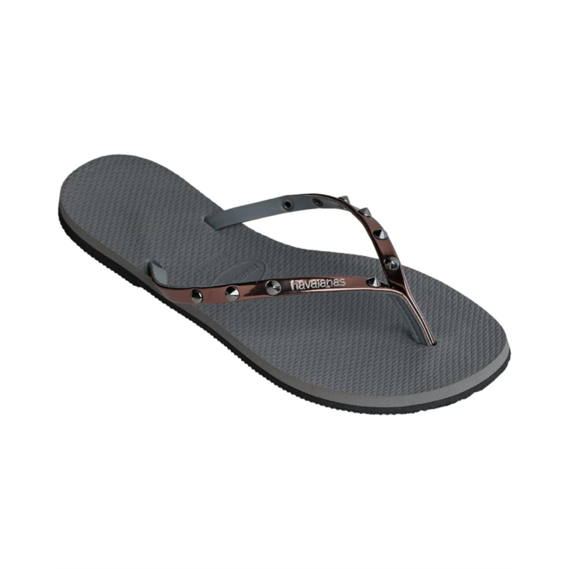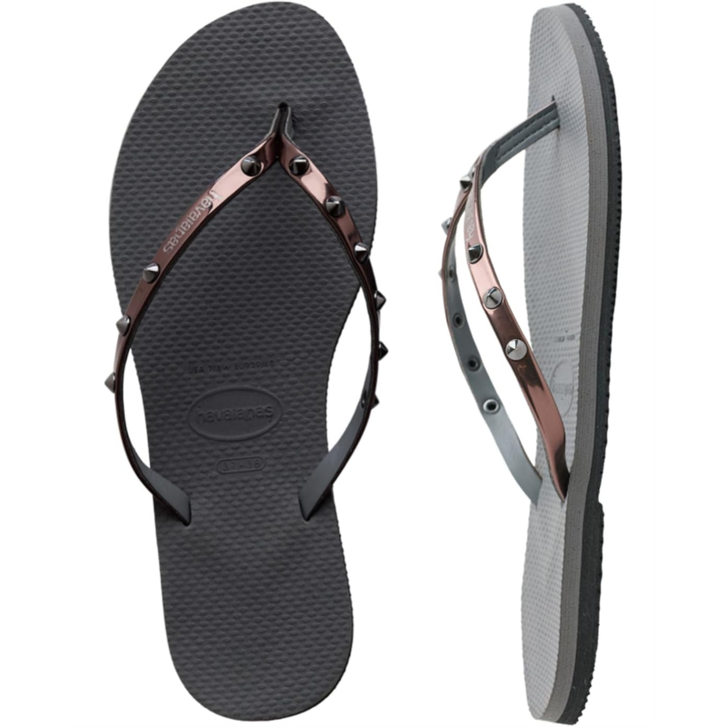 Comfortable and subtly stylish for your vacation at the beach, the Havaianas You Spike Sandals are designed with classy toe post design. These flip-flops are crafted with a rubber upper and lining that pops up the spike embellishment on the metallic silhouette straps.